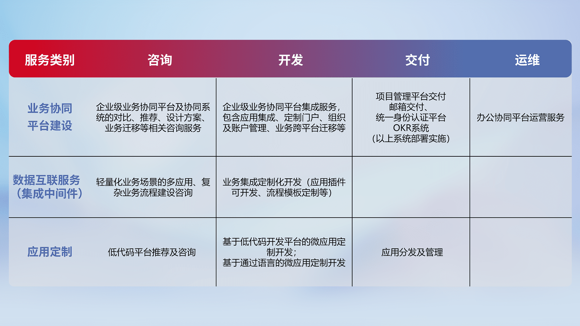 针对钉钉、、、企微、、、IDaas等平台级产品提供产品的规划、、方案、、、、交付、、、定制化开发等服务,,,,实现如统一协同办公、、、智能客户服务、、、混合会议管理、、、智能数据查询、、、等业务场景,,实现数字化转型。。
